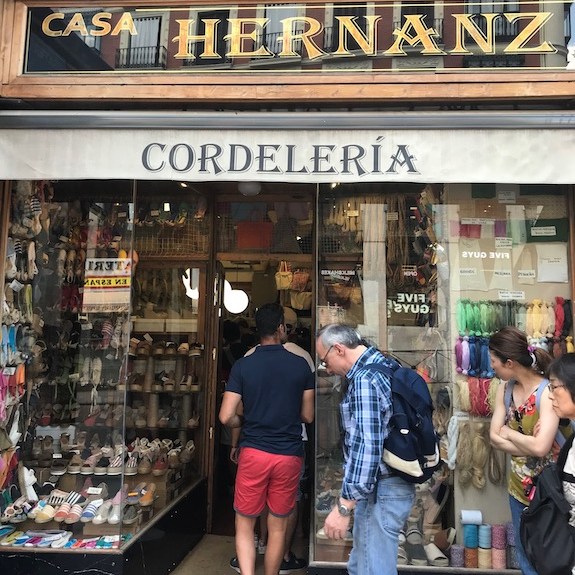 We finished our afternoon with more walking through the city; a stop at the espadrille shop, where they still make them by hand; and a well-deserved nap before our dinner at Los Montes de Galicia, which had been recommended to Espen by a colleague. One of the more memorable stories from our vacation came from our taxi driver that evening. Now 50, he had emigrated from Colombia many years before to live with his sister in Madrid. He had since gotten married (to another Colombian immigrant) and they had a son, who, to his chagrin, pronounced S as th in the Catalan way. “What kind of shit is that?” our driver asked, laughing.