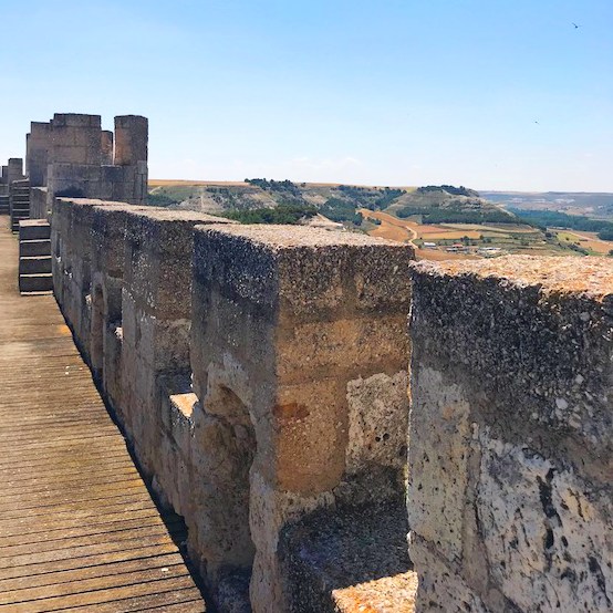 I will remember Aranda de Duero not for the city itself but for the drive there from Madrid. It was my introduction to the Spanish landscape, and I fell immediately in love. Sometimes we’d come across parts of the ancient Roman aqueduct … just there on the side of the road. It seemed as though every little village we passed had its own castle. Peñafiel was one such castle. Sitting atop a high hill against the blue sky, it was irresistible! It was also an official attraction, complete with tours. We were totally game.